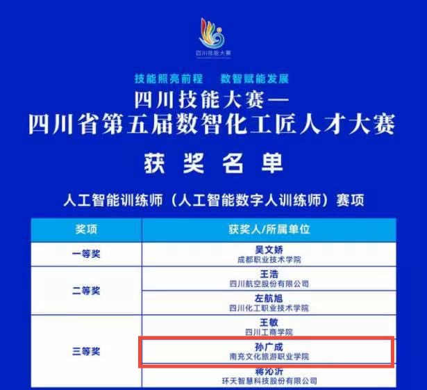 11月6日至7日,由四川省发展改革委(四川省数据局)、四川省人力资源和社会保障厅、四川省大数据中心、泸州市人民政府共同主办的四川省技能大赛—四川省第五届数智化工匠人才大赛在泸州圆满落幕。旅游系大数据技术专业孙广成老师凭扎实的专业功底和出色的实操能力,荣获比赛(人工智能训练师赛项)三等奖。
