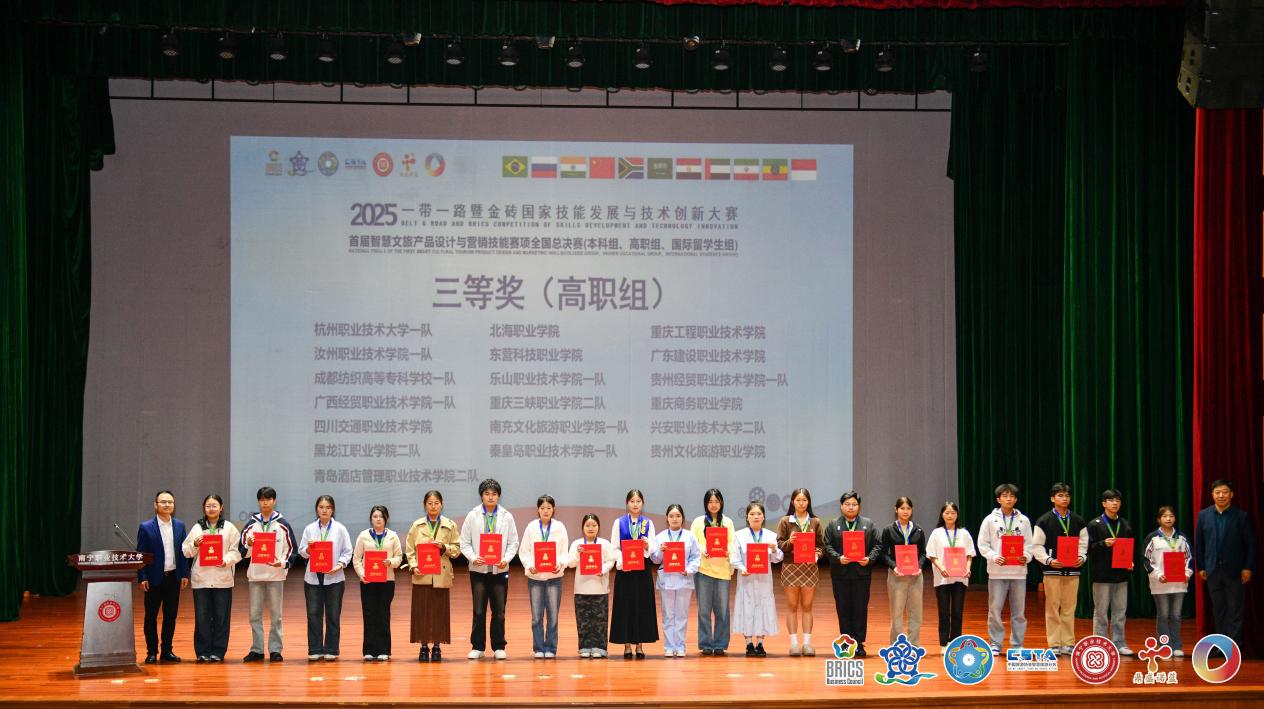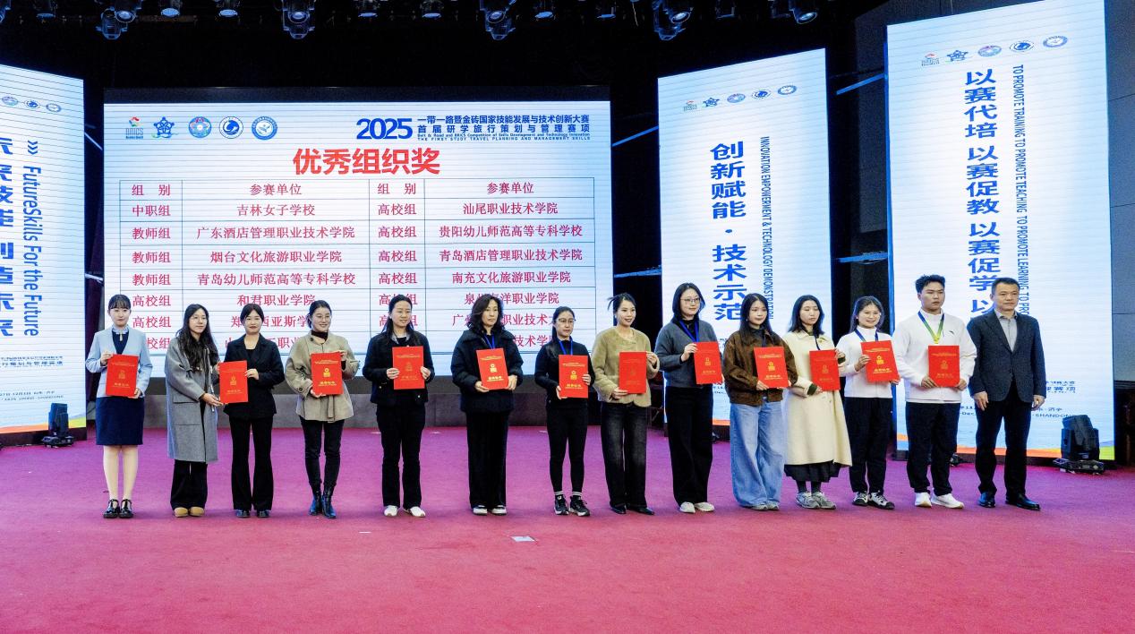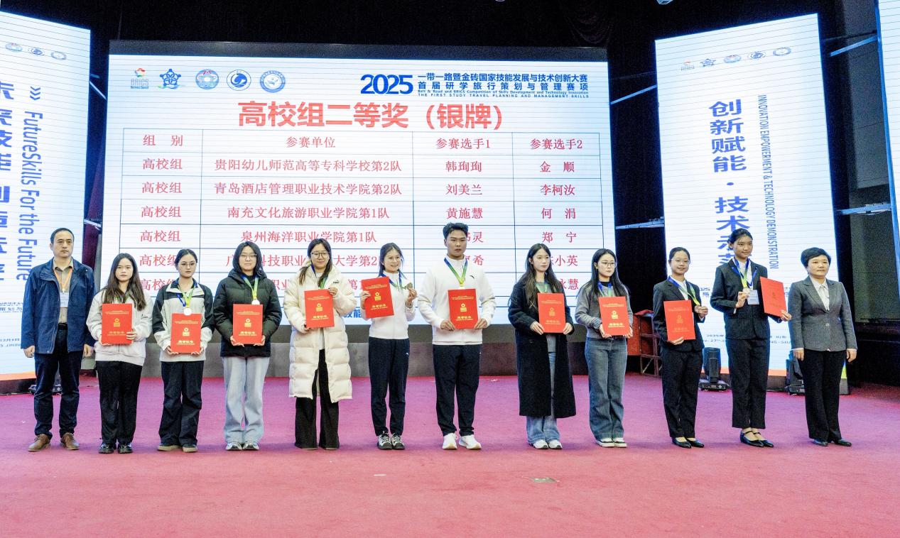 在近期2025一带一路暨金砖国家技能发展与技术创新大赛系列全国决赛中,旅游系代表队在多个赛项中表现突出,斩获多项重要奖项。其中,在智慧文旅产品设计与营销技能赛项全国总决赛中,我系教师与学生团队双双突围。教师组方面,智慧旅游教研室龙群才、席苗、李劲草、向程团队及李月娴、李环、蒲佳佳、何怡漫团队均荣获三等奖。学生组方面,王亿攀、蒋显奕、何玲玲、贾琰团队斩获三等奖;曾艳红、吴汶秀、罗诗颖、伍俊团队获优秀奖。