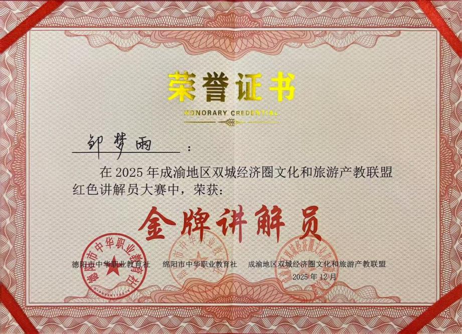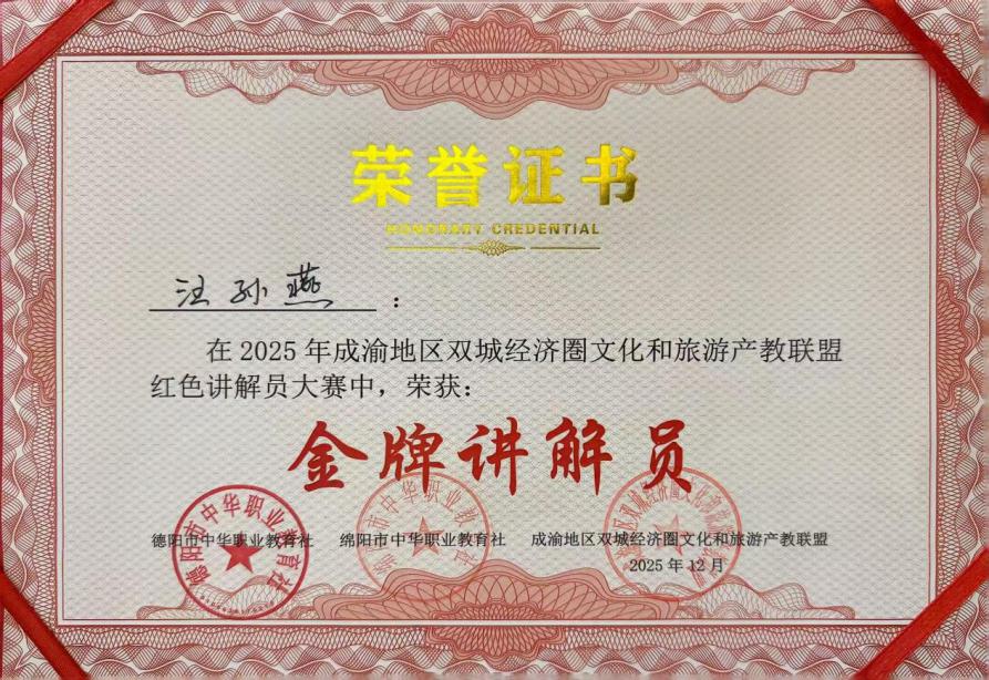 大赛设学生组与行业组两个组别,校企同台比拼。比赛紧紧围绕红色历史、时代精神与个人感悟,分设个人展示与自选讲解环节。经过前期选拔,共有来自成渝地区多所高校与行业单位的27名选手晋级决赛。我系2024级旅游管理专业学生邹梦雨(指导教师:任娟)、汪孙燕(指导教师:刘玥)同学代表学校参赛。在激烈角逐中,两位同学以扎实的专业素养、动情的表达和深刻的红色文化理解,脱颖而出,双双荣获“金牌讲解员”称号(决赛前十名获评金牌讲解员)。同时,我校因组织工作扎实、育人成效显著,获评“优秀组织单位”。