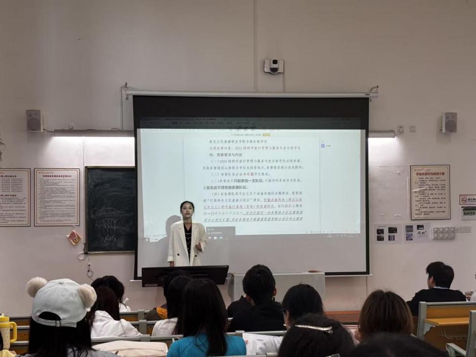 旅游管理、研学旅行管理与服务、智慧旅游技术应用及大数据技术专业各赛项负责老师分别就赛项规则、参赛要求、评分标准进行解读。本次大赛设置导游风采、智慧文旅产品设计与营销、大数据技术软件开发与网络技术、研学课程设计等赛项,实行2024级全员参与、2025级自愿报名的形式,采用初赛遴选、半决赛培优、决赛对抗模式,全面对接省赛、国赛标准。